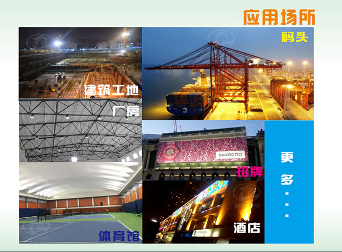 建筑工地、樓體亮化、酒店、碼頭、廠房、加油站、足球場、高爾夫球場、綠化景觀照明等。